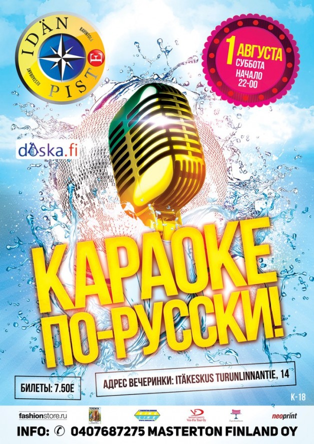 И так Вы любите петь, танцевать и веселиться ? В разгар финского лета, 1 августа бар "Idän Piste" в Itäkeskus приглашает Вас на вечеринку КАРАОКЕ ПО-РУССКИ !!! Лучшие исполнители получат призы от заведения! Начало в 22.00 Не важно сколько Вам лет приходите петь русские песни в бар "Idän Piste" на вечеринку КАРАОКЕ ПО-РУССКИ, если поёт душа!!! Адрес: Itäkeskus Turunlinnantie ,14 Билеты 7,50евро Дополнительная информация по тел.0407687275 Masterton Finland Oy дата события *-автор *адрес сайта продажи билетов событияцена